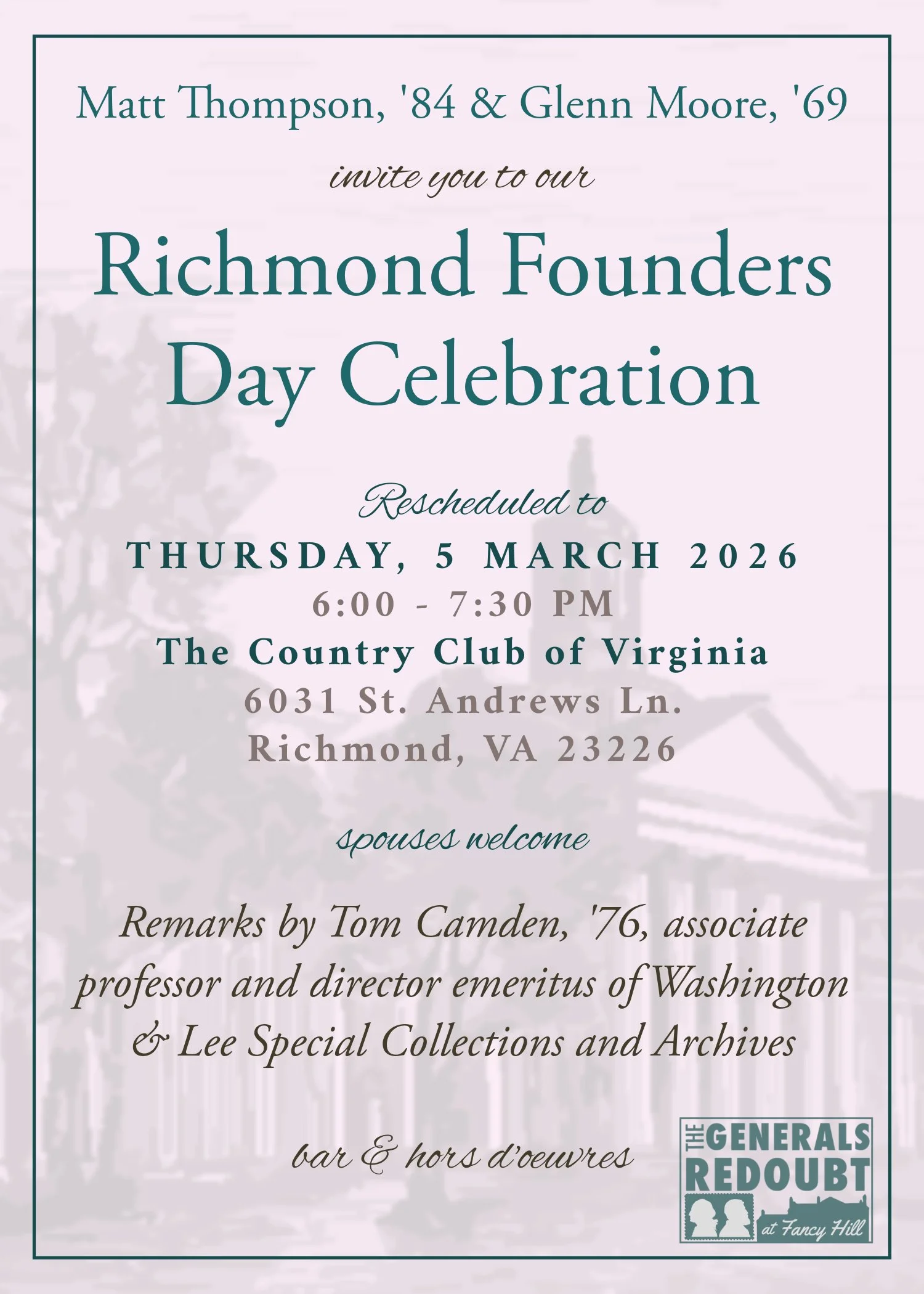 Back to All Events Richmond Founders Day Party Thursday, March 5, 2026 6:00 PM 7:30 PM The Country Club of Virginia 6031 Saint Andrews Lane Richmond, VA, 23226 United States (map) Google Calendar ICS Please join us in Richmond to celebrate Founders Day, hosted by Matt Thompson, ‘84, and Glenn Moore, ‘69. Remarks will be offered by Tom Camden, ‘76, associate professor and director emeritus of Washington & Lee Special Collections and Archives. Drinks and hors d’oeuvres will be served.Click HERE to RSVP: https://www.punchbowl.com/parties/richmond-founders-day-tgr-2026 Contact info@thegeneralsredoubt.us with any questions.
