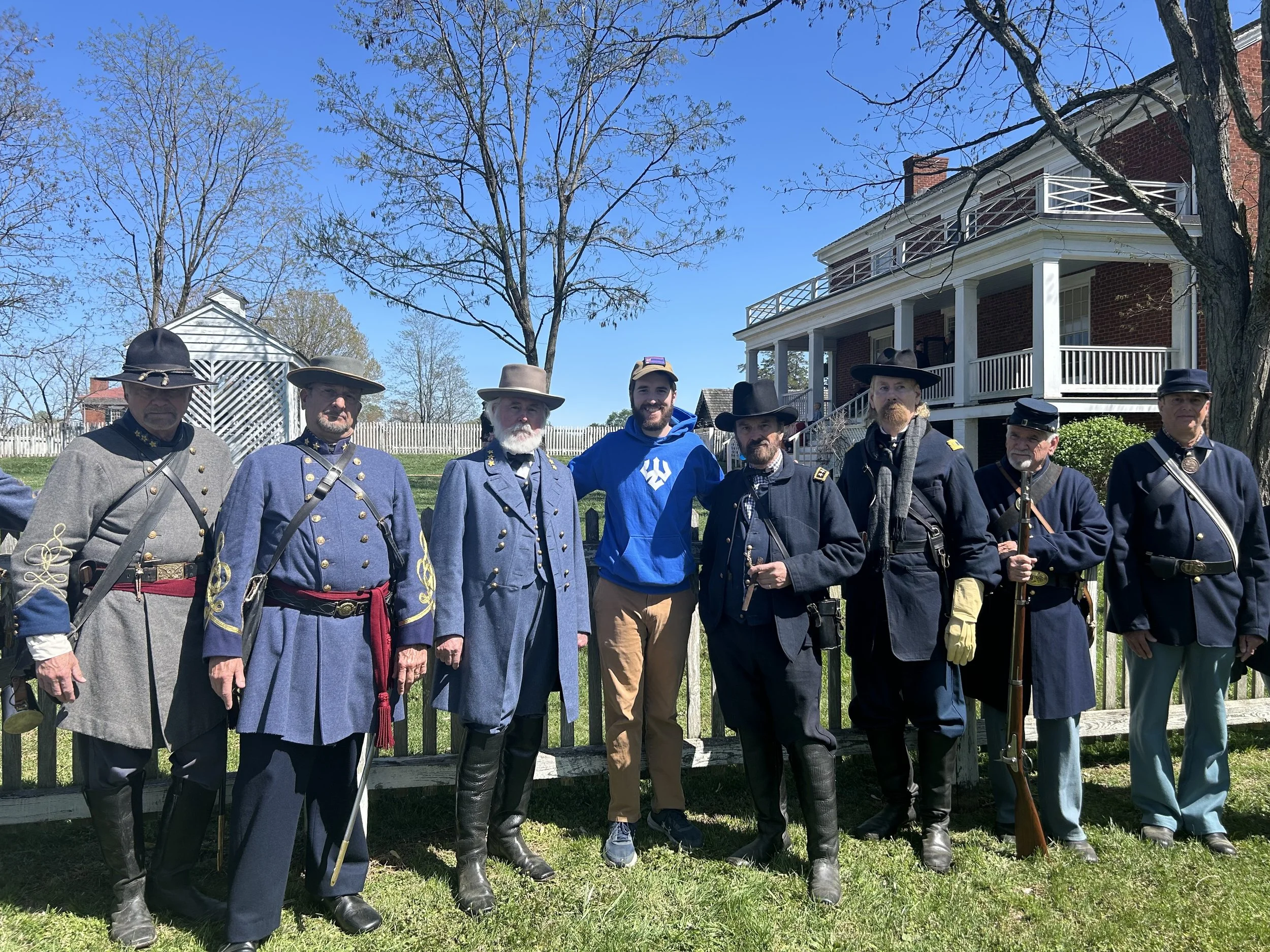 [Kamron Spivey (center) stands with reenactors demonstrating Generals Lee and Grant’s interaction at the McLean House in Appomattox, Virginia. Photo: April 9, 2025]